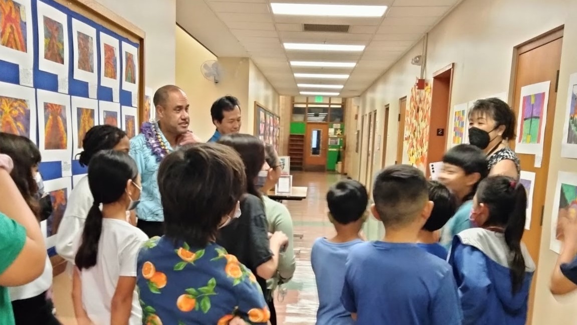 In February 2024, Senator Donovan Dela Cruz and Representative Lauren Matsumoto attended the closing ceremony for a Mililani Mauka Elementary School student exhibit, created during an Artists in the School residency with Artistic Teaching Partner Alyce Dodge. Students did a show-and-tell with the legislators about the artworks they created during the residency, in which they explored traditional barkcloth patterns throughout the Pacific.