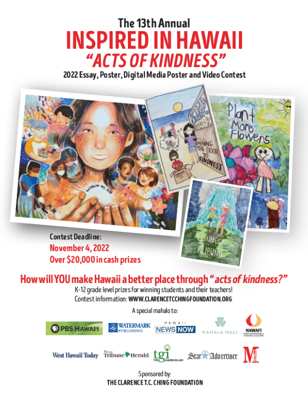 Call for student artists! Hawaiʻi students K-12 are invited to enter the Clarence T.C. Ching Foundation “Inspired in Hawaiʻi: Acts of Kindness” 2022 essay, poster, digital media poster and video contest. Entries must be received by Friday, November 4, 2022, 11:00 a.m. For contest information and to enter, please visit ClarenceTCChingFoundation.org/Contest-Information.