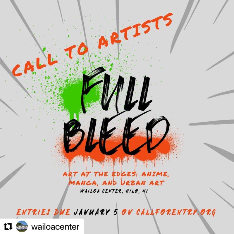 - Wailoa Center call for artists: “Full Bleed, Art at the Edges: Anime, Manga and Urban Art”. Entry deadline January 5, 2024. For more information, please visit the call detail on CallForEntry.org: artist.callforentry.org/festivals_unique_info.php?ID=12654.