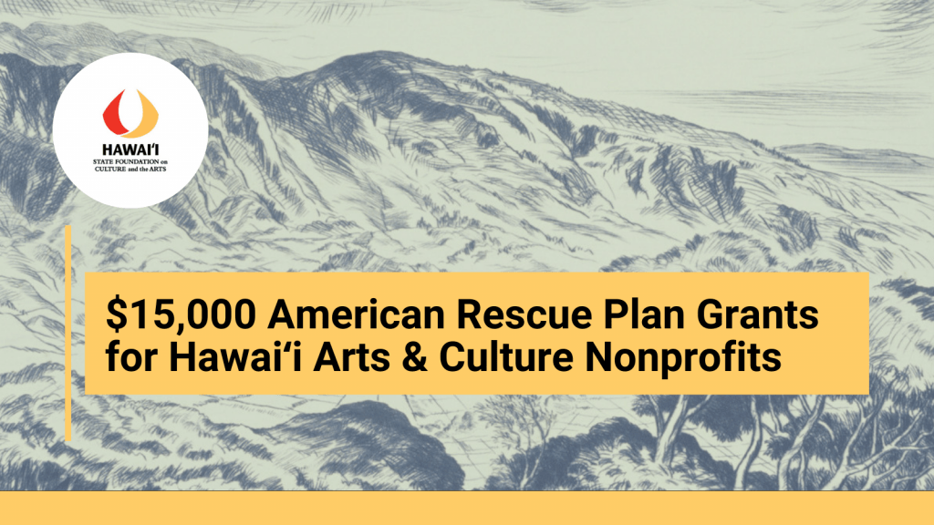 The State Foundation on the Culture and the Arts utilized American Rescue Plan (ARP) funding in 2021 to administer two grants benefiting the state’s arts community: one for nonprofit organizations and one for individual artists and cultural practitioners. Applications closed for the SFCA ARP Grants for Organizations on July 31, 2021. Read more about projects funded by the grants, and additional grants and fellowships funded by ARPA, on the SFCA website: SFCA.Hawaii.gov/ARPA.