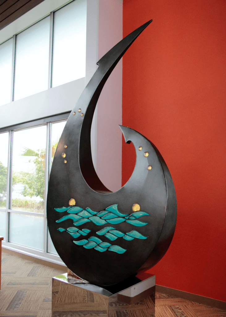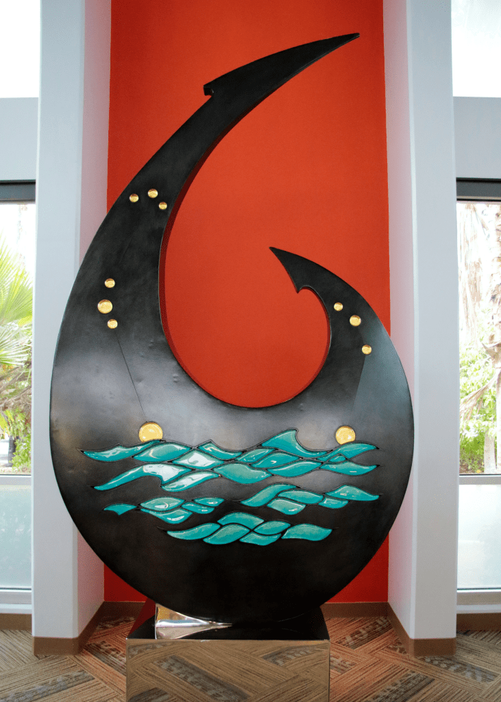 A freestanding stainless steel and cast glass sculpture based on the legendary fishhook of Polynesian culture figure Māui. The imagery on the two flat sides are the golden stars in the constellation Mānaiakalani, setting into the multi-hued blue waters of the coast of Nānakuli. At the top of the hook is the constellation Hina ia ʻEleʻele, representing the feminine counterpart to Māui and his perpetual pursuit of her through the sky. The sculpture is lit from within, allowing the glass to illuminate the story day and night.