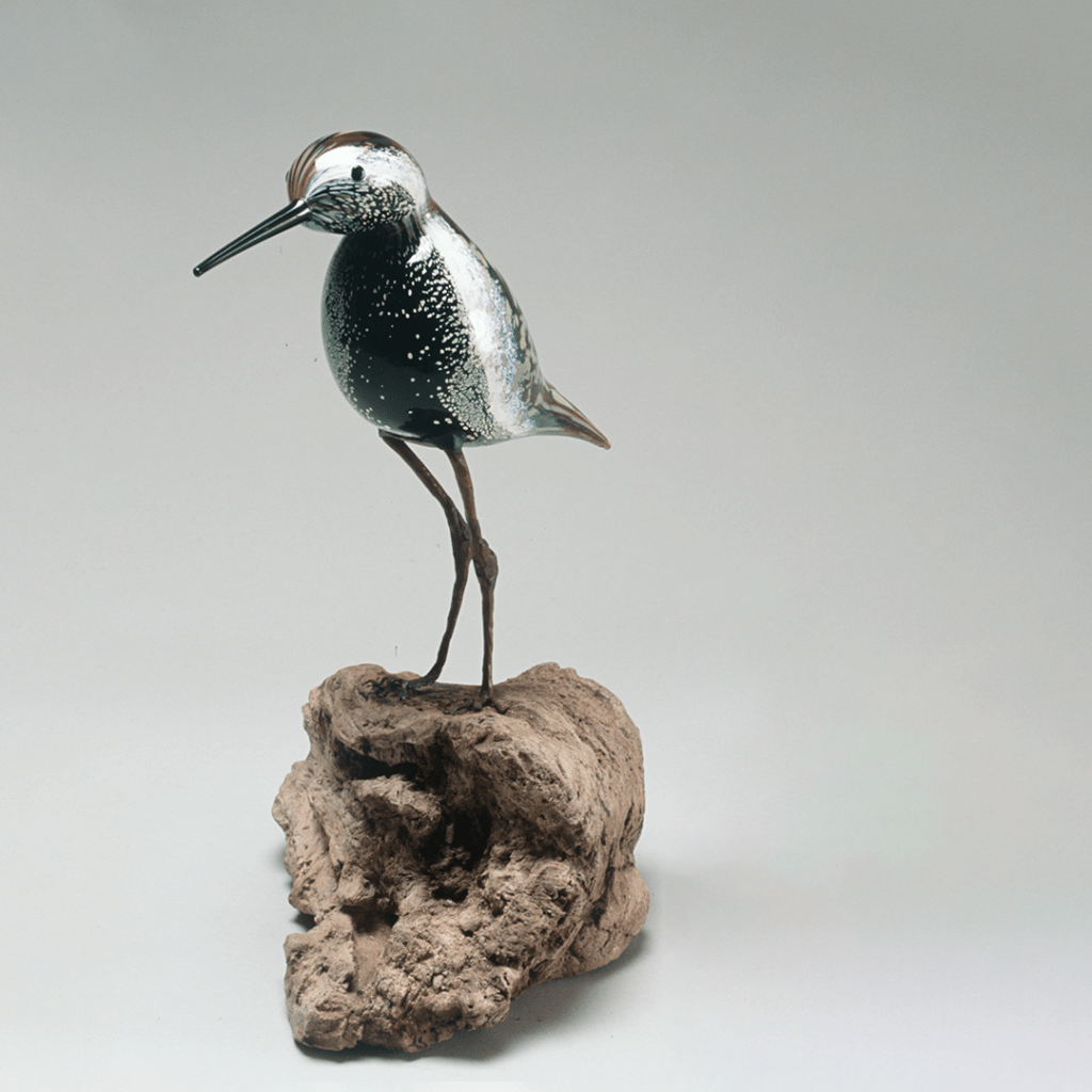 Artist statement: Emily Thomas’ work aspires to communicate the beauty and fragile balance of nature. She chose the kolea (Pacific Golden Plover) for its importance in Hawaiian oli (chants), mele (song), ‘olelo (language), and hula. These birds’ nest in Alaska and migrate to the Hawaiian Islands during the winter months. Thomas explains that in her work glass symbolizes the fragility of life while copper represents the bird’s strength and resilience. The bird is mounted on ocean-weathered driftwood. Thomas was born in Cooperstown, New York, but has lived in Hawai’i since she was two years old. She earned her BFA with a major in glass blowing from the University of Hawai’i at Manoa before receiving the Susan Steinhauser/Daniel Greenberg Scholarship to attend Pilchuck Glass School in Stanwood, Washington.