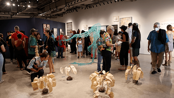 Image: photograph of Hōʻikeākea Gallery at Leeward Community College during the opening reception for the “ʻAi Pōhaku, Stone Eaters” exhibit. Photo credit: Leeward Community College.